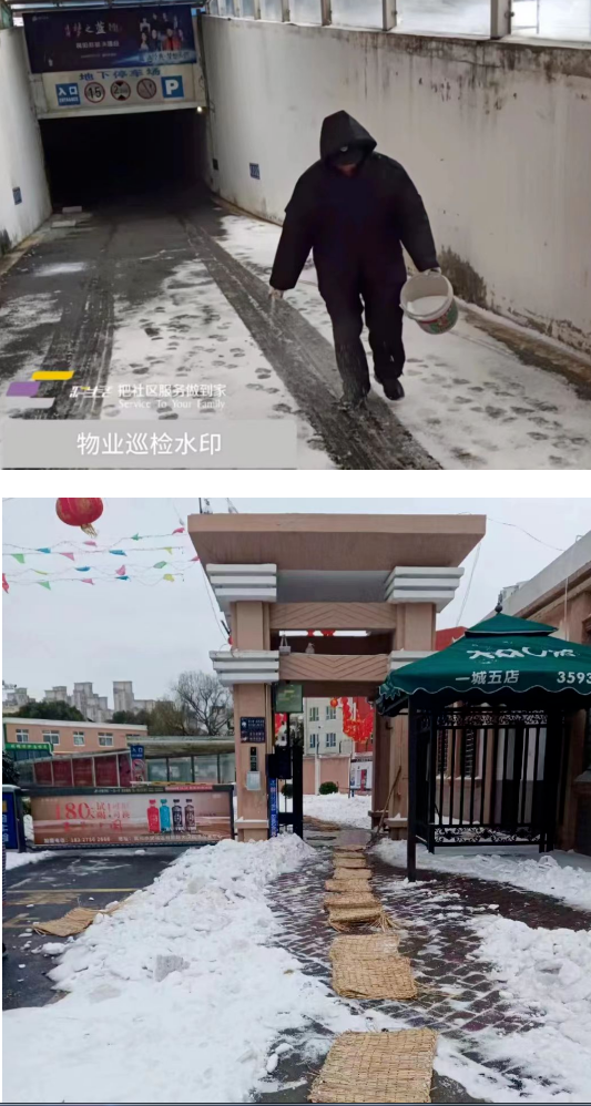 下雪开始后,铁四院和谐家园全面投入到应对大雪恶劣天气的应急处理工作中,在小区范围内对单元楼栋,门前支路、坡道路面、台阶等部位进行融雪盐的投放,并在关键部位铺放防滑草垫。