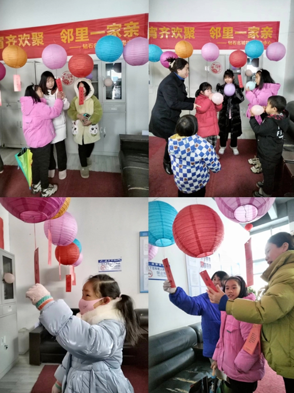 钻石名城开展了“元宵齐欢聚,邻里一家亲”的活动,与业主们共度佳节。活动现场挂满了五颜六色谜面纸,灯谜吸引了不少业主,大家你一条我一条,争先恐后地竞猜抢答。
