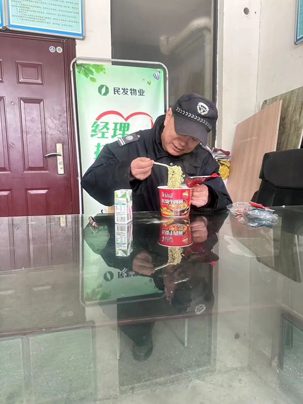 中午11:00,是队员们吃午饭的时间,王安国没有自带午饭,吃了公司发放的泡面。我问他这样是不是太简单了,他说随便吃一点,晚上回家吃好的。