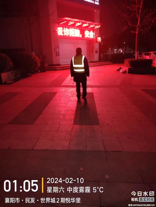 2月10日晚上,王安国值夜班,当万家灯火熄灭的时候,当小区业主们都进入梦乡的时候,他还在小区内外巡逻。他手里微弱的灯光让小区的夜晚多了一份安心。当谈及春节无法在家享受团圆喜悦的时候,他表示并不在意,因为工作是他的责任。