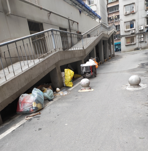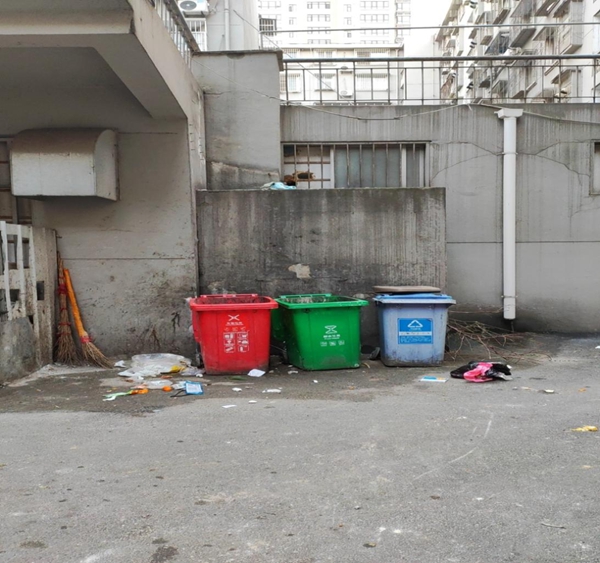 上榜理由:垃圾桶配备不标准、无盖、垃圾外溢,三车停放不规范、楼道乱堆放。