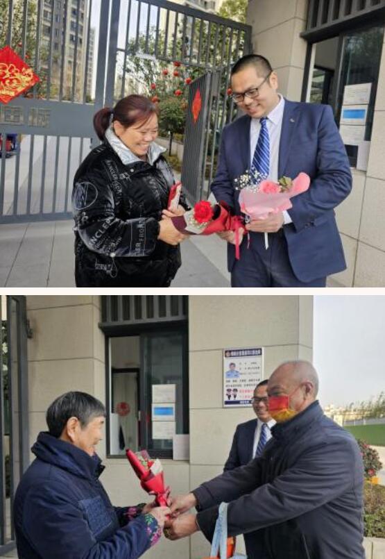 康乃馨的花语是热情、祝福,粉色代表感激,红色则表达赞赏。朵朵的鲜花送到女性业主的手上,换回的是一张张开心的笑容。