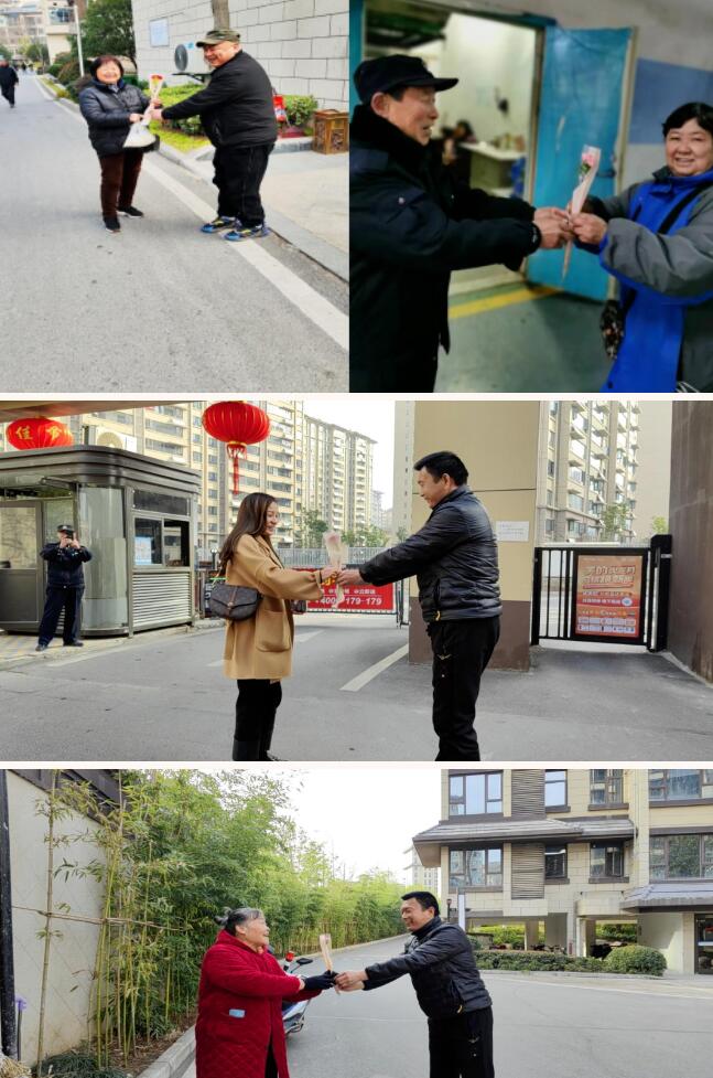 草长莺飞,春日渐近,伴随着浓浓的春意,一年一度的三八妇女节来临了,为了让山河万里小区的女同胞们感受到节日特有的祝福和心意,三岳人和物业特准备了鲜花康乃馨。为了给女同胞们送上节日的祝福,物业工作人员忙着整理、剪枝、撵花、包装。物业工作人员组成“献花队伍”,在门岗、小区里、进行送鲜花活动。大家送给买菜归来的阿姨、送给匆匆上班的妈妈、送给晨练的奶奶,祝福她们生活美好,身体健康!美丽快乐!一句"祝您女神节快乐!让业户感受到物业的贴心服务。收到鲜花的业主都笑逐颜开,脸上的幸福不自觉的溢出来。