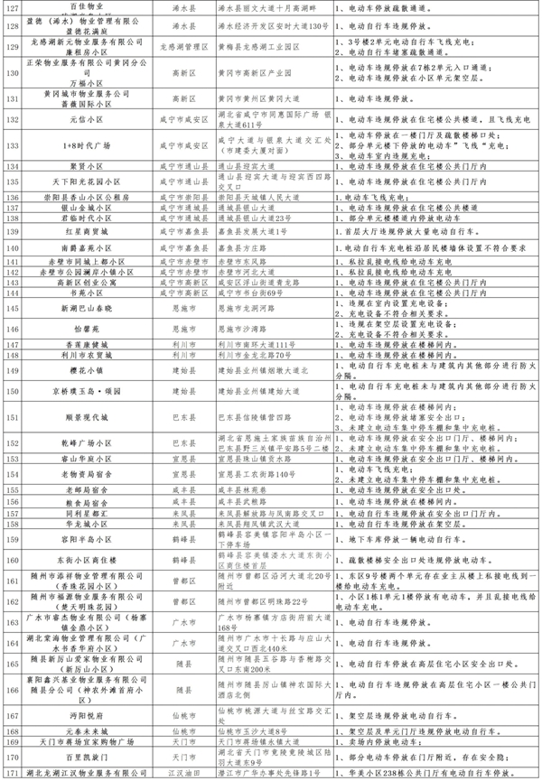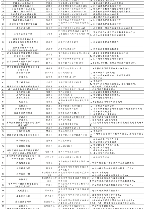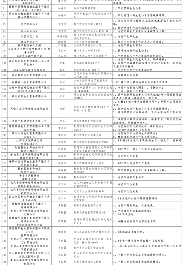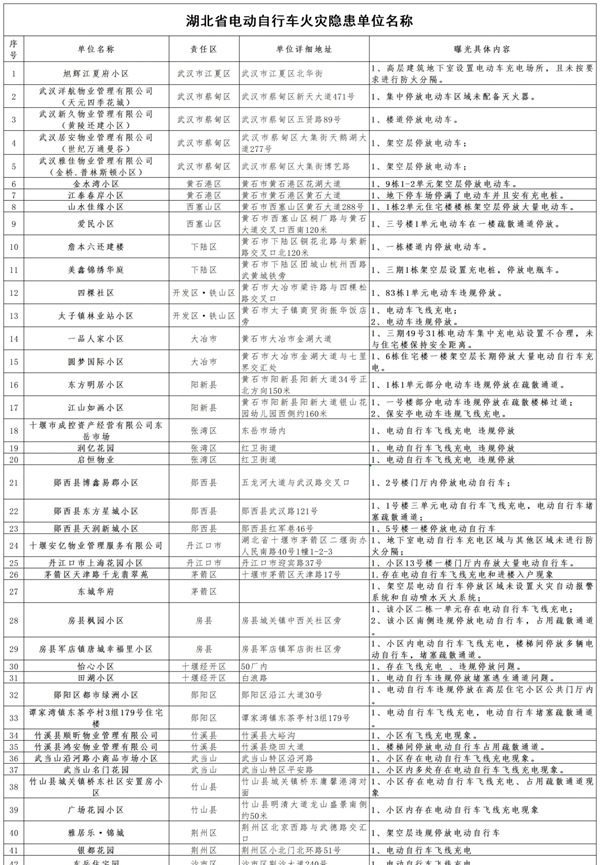预防为主,生命至上!为深刻汲取近期电动自行车火灾事故教训,进一步规范电动自行车消防安全管理工作,连日来,湖北消防救援总队周密部署、迅速行动,全面排查整治电动自行车消防安全隐患,进一步筑牢社会火灾防控基础。现曝光全省171家小区、物业单位,强化追责问责,推动电动自行车火灾隐患整改,切实织密消防安全防护网。希望以下单位积极落实消防安全主体责任,及时整改消除隐患。