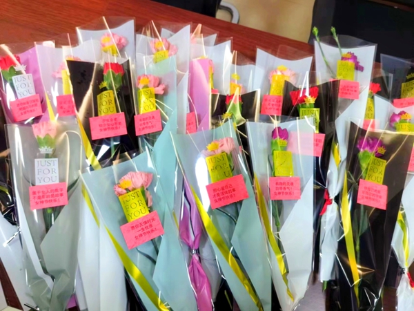 活动前一天,物业客服人员细心的做了各项准备工作。醒花、修剪、捆扎,精心挑选每一朵娇艳的鲜花,贴上充满浓浓爱意的祝福语,用行动送上对小区女性们最真挚的祝福,让鲜花赋予这个节日应有的仪式感。