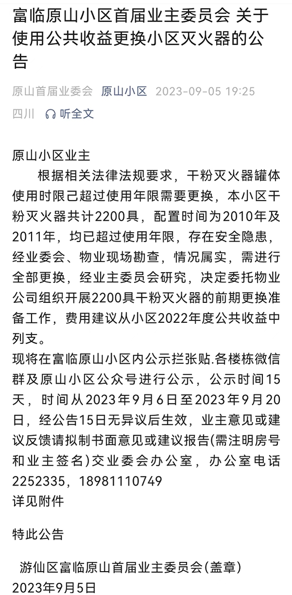 上图信息为四川一小区使用小区公共收益更换超过使用年限的灭火器