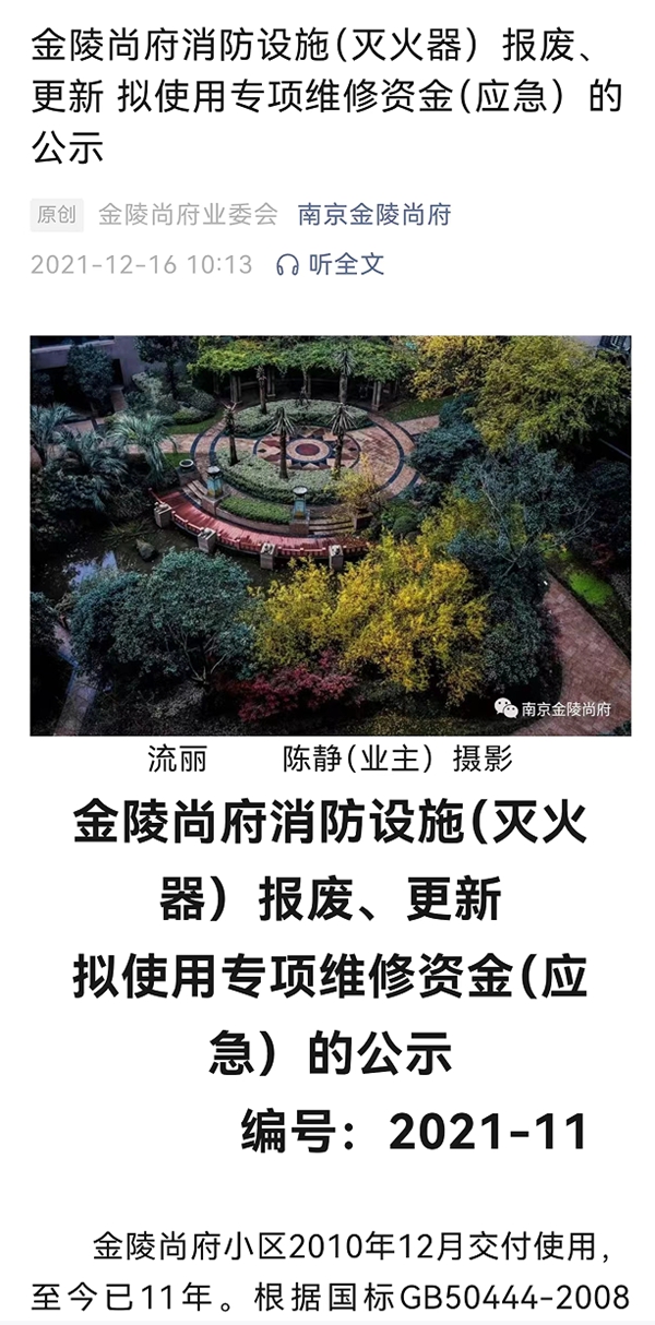 上图信息为南京一小区拟使用专项维修资金对报废的灭火器进行更新