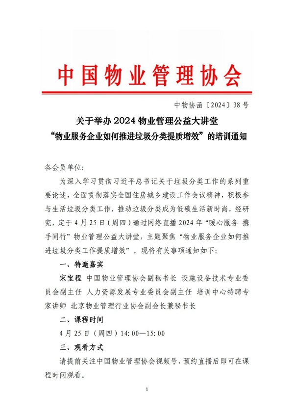 关于举办2024物业管理公益大讲堂“物业服务企业如何推进垃圾分类提质增效”的培训通知