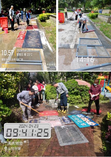 活动开始前,物业的工作人员提前做好各项准备工作,等待前来清洗地垫的业主家人们。活动开始后,业主们陆陆续续带着各式各样的地垫来到了活动现场,物业工作人员接好水龙头,手拿水枪、刷子、清洁剂,开始忙碌起来,将每块地毯打湿、撒上清洁剂,有的冲、有的刷、有的拧、有的晾……在一片“洗刷刷”声中,原本乌黑的地毯,经过清洗后焕然一新。