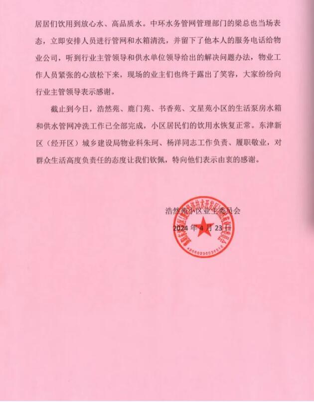 4月17日凌晨开始,一场近10小时的突然停水,让东津南还建小区(浩然苑、鹿门苑、书香苑、文星苑、鹿鸣苑)近7000户居民的正常生活受到影响,由于事前未提前对用户进行通知,造成近万名居民的生活不能正常进行。待供水恢复后,又出现水是混浊的,不能正常使用。区城乡建设局接到问题反馈后,第一时间与中环水务工作人员到小区的供水泵房、业主家中进行查看,协调供水公司对小区供水水箱、管网进行彻底清洗,确保居居们饮用到放心水、高品质水。