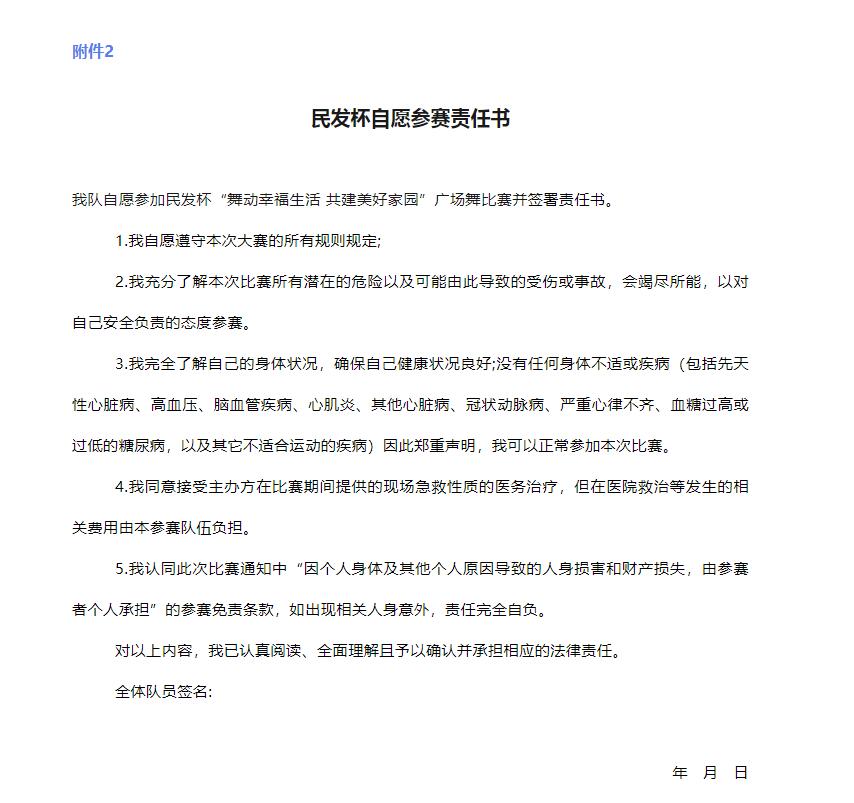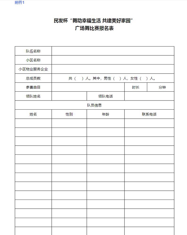 附件:1. 民发杯“舞动幸福生活 共建美好家园”广场舞比赛报名表