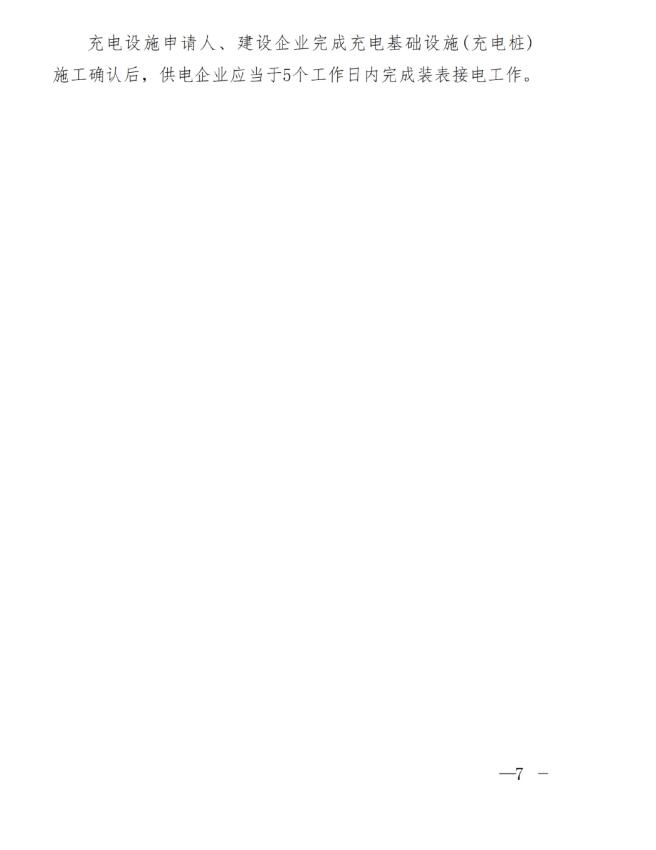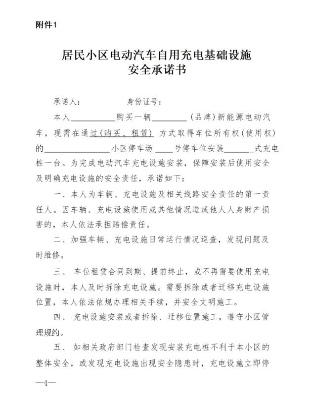 充电桩安装单位凭《居民小区电动汽车自用充电基础设施 安全承诺书》即可进驻物业管理小区进行施工。施工期间,物 业服务企业应当配合申请人开展充电设施的安装工作,安装单 位应遵循相应安装规范和技术要求进行施工,施工过程中对小 区共用部位、共用设施造成损坏的,应承担相关责任。充电设施工程实施完毕后,供电企业按规定时限完成装表接电工作。本通知自下发之日起正式执行。各县(市)可结合自身实际,参照执行。