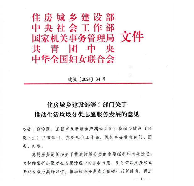 为全面贯彻落实习近平总书记给垃圾分类志愿者的重要回信精神,进一步推动生活垃圾分类志愿服务工作,住房城乡建设部会同中央社会工作部、国管局、共青团中央、全国妇联于日前联合印发《关于推动生活垃圾分类志愿服务发展的意见》(以下简称《意见》),促进垃圾分类志愿服务制度化、规范化、常态化,助力美丽中国建设。