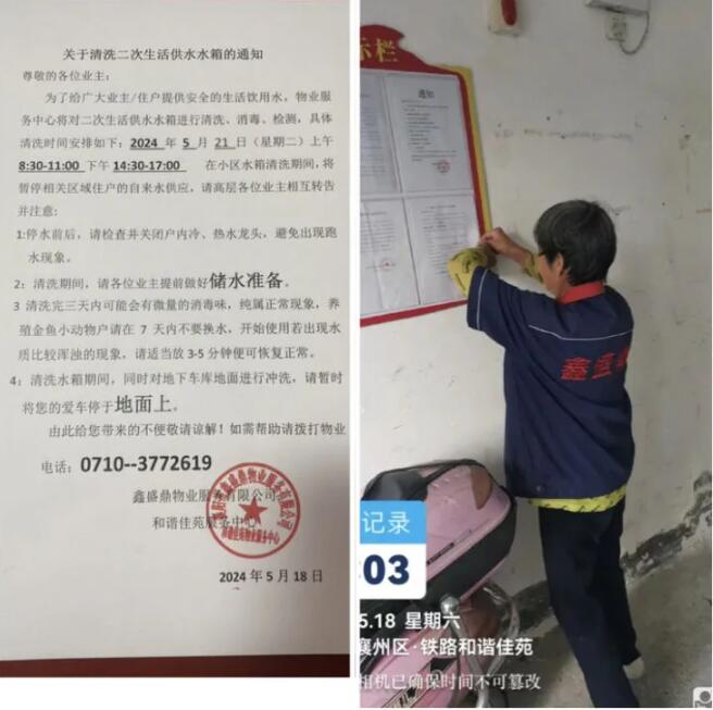 为了保障小区居民生活饮用水卫生、安全,名城路铁路和谐佳苑服务中心全体员工于2024年5月21日8:00开始对小区水箱进行了清洗、消毒、检测,确保业主饮水安全。 为了尽可能减少对业主生活的影响,客服人员提前3天将停水通知张贴在公告栏内,并在业主群发送温馨提示,提醒业主们提前储备用水。