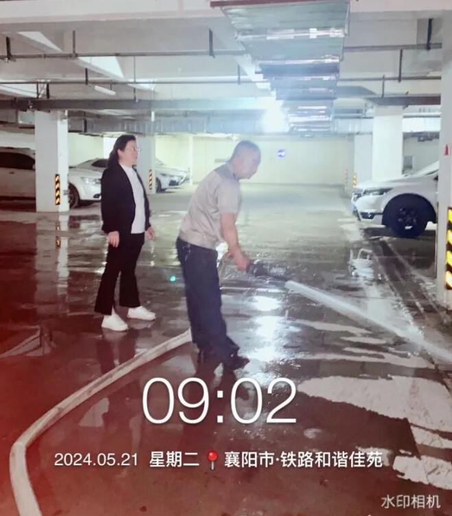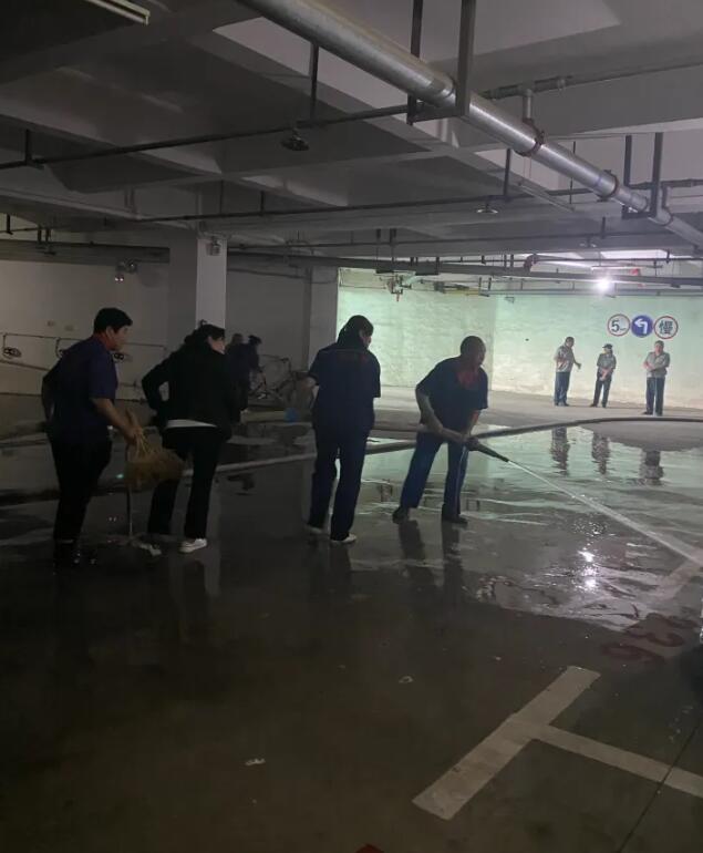 工程、安保、保洁、绿化客服全体工作人员 利用清洗水箱后的不用水对地下车库进行了同时清洗。