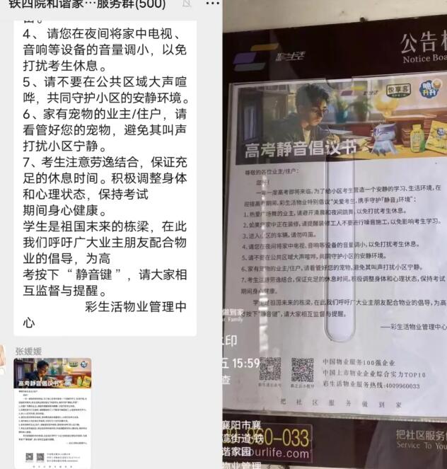 铁四院和谐家园进入6月以来,已开启“静音护航”模式,通过张贴倡议书宣导、微信群温馨提示等对所有业主发起爱心助考倡议,呼吁全体业主爱心助考,号召业主家人们为考生营造安静的作息环境,劝导高考期间不跳广场舞,工程人员严格做好装修巡检工作,限制装修施工,防止噪声干扰学生复习休息,并提醒进入小区车辆要减速慢行,禁止鸣笛等,做好爱心宣传工作。