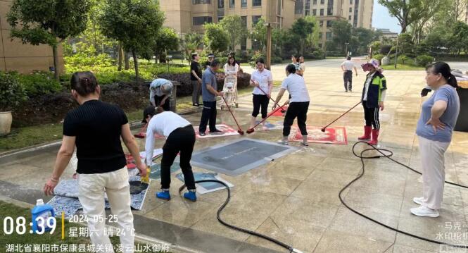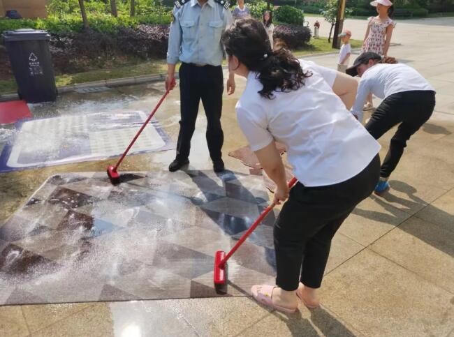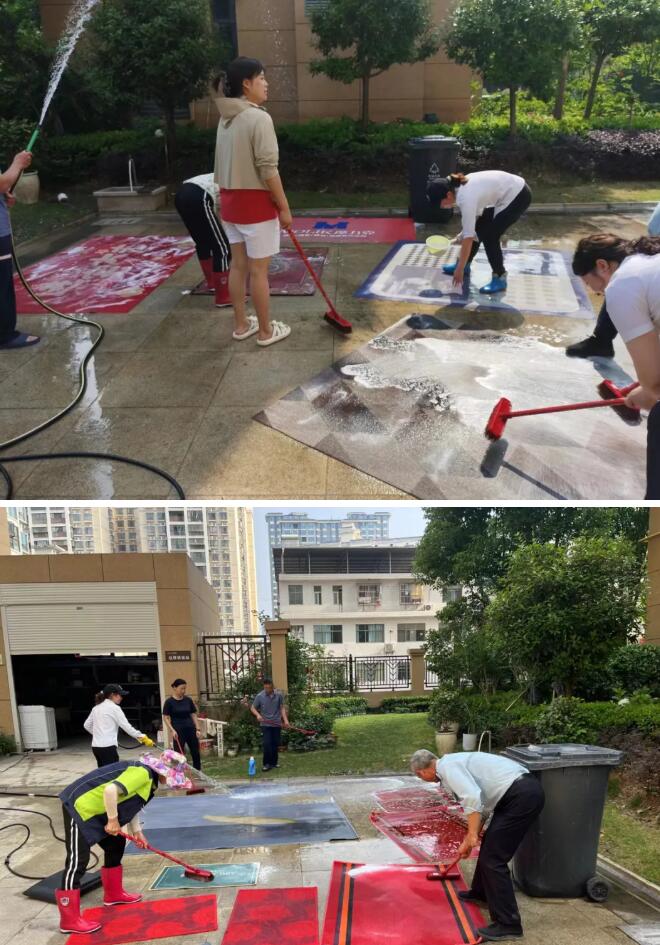 在活动现场,物业人员分工明确,一人手握清洗工具冲洗地垫、一人手拿清洁液洗刷;随着物业人员的认真冲洗、刷干操作,一块块地垫上的污渍被洗刷得干干净净、焕然一新。