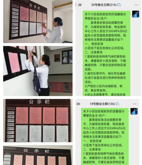 消杀蚊蝇、灭鼠、防蛇工作之前,物业工作人员在业主微信群、公示栏提前发布温馨提示,提醒小区业主注意安全事项。