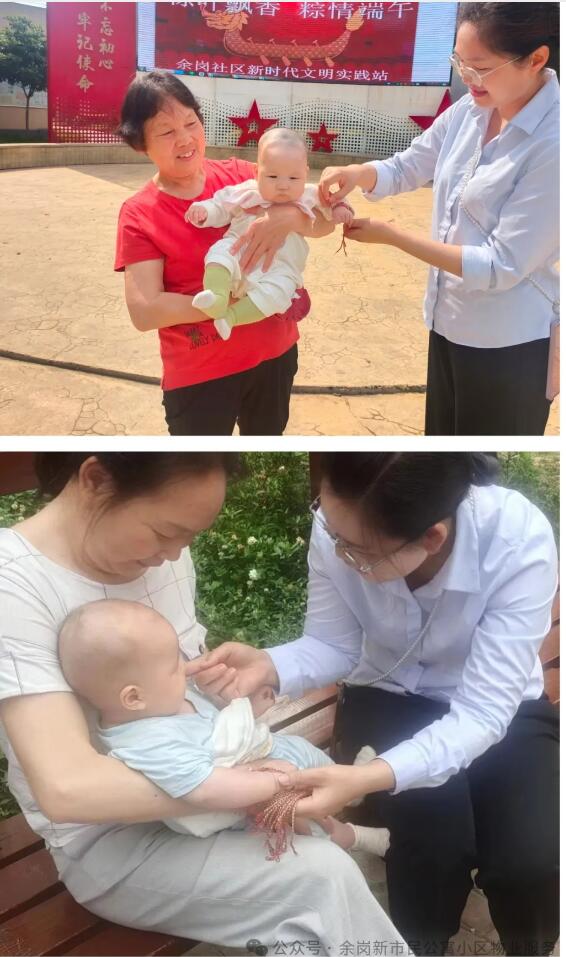 端午节送福绳是一种传统习俗呢。福绳通常也被称为五彩绳,一般用五种颜色的线编织而成。活动现场工作人员给小朋友们亲自系上福绳,希望通过送福绳带来好运、驱邪避灾。送福绳传递着美好的祝福和关爱,它不仅是一份礼物,更是对传统文化的传承和延续。