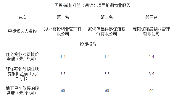 根据前期物业管理招标投标的有关法规、规章和该物业管理项目招标文件的规定,国投·岸芷汀兰(观锦)项目前期物业服务于2024年11月4日发出招标公告, 2024年11月25日9时30分在湖北省襄阳市樊城区新华路铁路大厦16楼会议室开标,并于2024年11月25日完成评标工作,现将开标结果公示如下:
