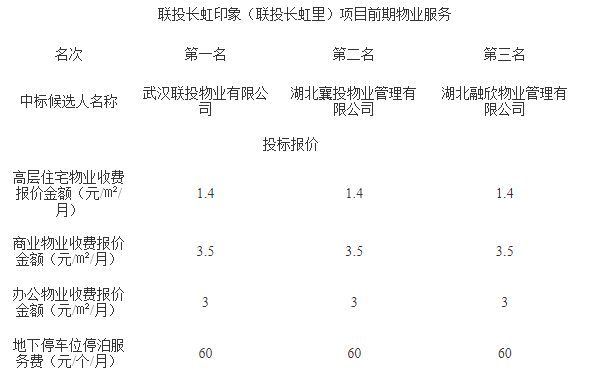 根据前期物业管理招标投标的有关法规、规章和该物业管理项目招标文件的规定,联投长虹印象(联投长虹里)项目前期物业服务于2024年11月6日发出招标公告, 2024年11月27日9时30分在湖北省襄阳市樊城区新华路铁路大厦16楼会议室开标,并于2024年11月27日完成评标工作,现将开标结果公示如下: