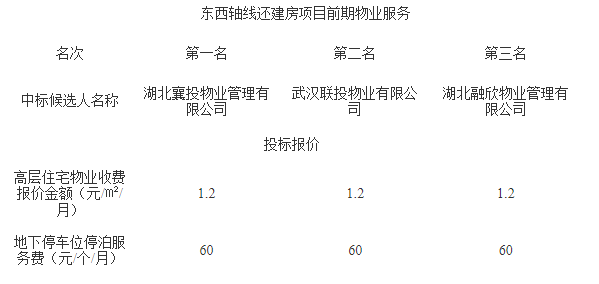 根据前期物业管理招标投标的有关法规、规章和该物业管理项目招标文件的规定,东西轴线还建房项目前期物业服务于2024年11月7日发出招标公告, 2024年11月28日9时30分在湖北省襄阳市樊城区新华路铁路大厦16楼会议室开标,并于2024年11月28日完成评标工作,现将开标结果公示如下: