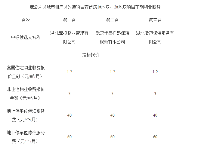根据前期物业管理招标投标的有关法规、规章和该物业管理项目招标文件的规定,庞公片区城市棚户区改造项目安置房1#地块及2#地块项目前期物业服务于2025年3月3日发出招标公告, 2025年3月24日9时30分在湖北省襄阳市樊城区新华路铁路大厦16楼会议室开标,并于2025年3月24日完成评标工作,现将开标结果公示如下:
