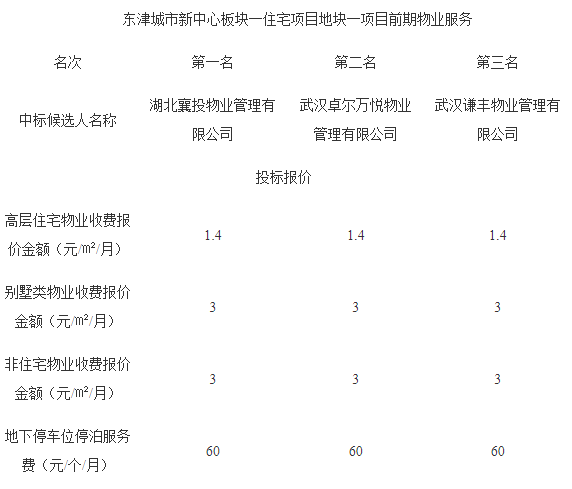 根据前期物业管理招标投标的有关法规、规章和该物业管理项目招标文件的规定,东津城市新中心板块一住宅项目地块一项目前期物业服务于2025年3月18日发出招标公告, 2025年4月8日9时30分在湖北省襄阳市樊城区新华路铁路大厦16楼会议室开标,并于2025年4月8日完成评标工作,现将开标结果公示如下: