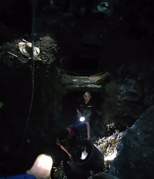 19点多,工程部师傅满身的泥浆、被汗水一遍又一遍浸透的工作服紧紧的贴在身上,在近3米的深坑中奋战了近8小时,疲惫和体力透支未让他们退缩,他们依然奋战在抢修一线,夜色中他们靠着灯光,继续战斗。