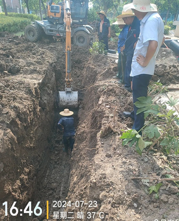 地下管网的错综复杂让大家始料不及,挖机设备无法施工,只能上人工,工程部几名同志冒着38℃高温,下到2.5深的沟中进行人工开挖,你一锄头、我一铁锹,最深处的地方,因位置窄小工具无法伸展,工程师傅只能用手一把一把的把土刨开,汗水浸湿了衣服也未停下手里的动作,下挖2.9米深度,在大家的不懈努力下终于将压坏的排水管道找了出来。