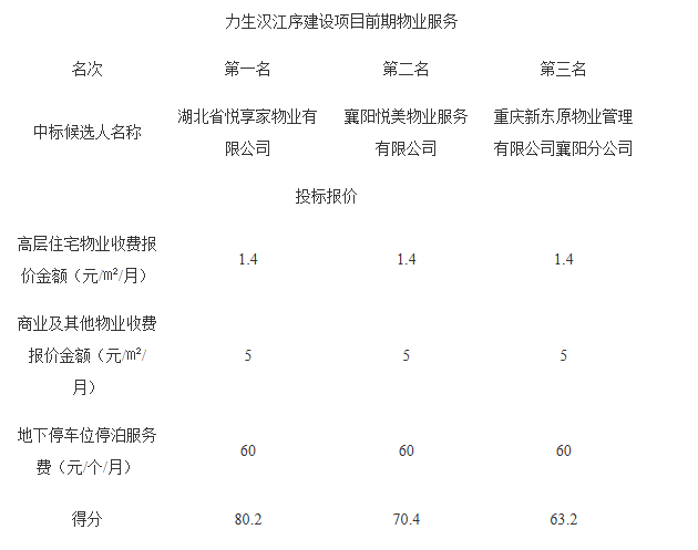 根据前期物业管理招标投标的有关法规、规章和该物业管理项目招标文件的规定,力生汉江序建设项目前期物业服务于2025年4月9日发出招标公告, 2025年4月30日9时30分在湖北省襄阳市樊城区新华路铁路大厦16楼会议室开标,并于2025年4月30日完成评标工作,现将开标结果公示如下: