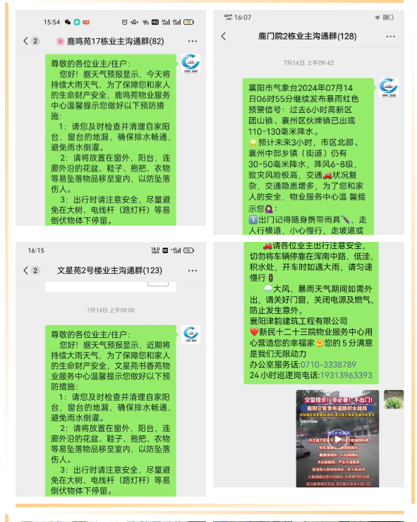 汛情危急,以“时时放心不下”的责任感,通过业主微信群等渠道,及时发布预警信息和温馨提示。各项目工作人员坚守岗位,无惧大雨,对污水井、集水坑、雨水井等一一进行排查,保证雨水能够顺畅排除。对地下车库出入口、地下室及人防、首层出入口逐一检查。同时对各个排水井流入的淤泥杂物进行及时清理,确保有效排水。各项目值班人员24小时不间断巡查,时刻关注汛情动态,确保每一处安全隐患都被及时发现并处理。