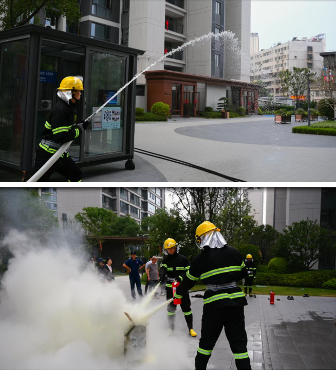 演练伊始,消防大队宣传员以“防火巡查、疏散组织、火场逃生、初期扑救”四大主题为切入点,结合物业礼宾员日常巡逻特点,系统讲解了火灾隐患自查方法、火场逃生要诀及灭火器使用规范。现场还演示了消防水带收放技巧、防火服快速穿戴等实操细节,让参训人员“零距离”掌握消防技能。
