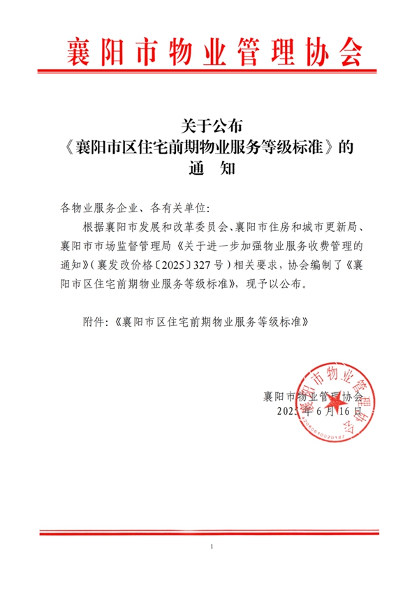 根据襄阳市发展和改革委员会、襄阳市住房和城市更新局、襄阳市市场监督管理局《关于进一步加强物业服务收费管理的通知》(襄发改价格〔2025〕327 号)相关要求,协会编制了《襄阳市区住宅前期物业服务等级标准》,现予以公布。