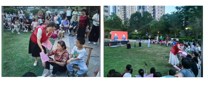 夕阳还在天边留着最后一抹余晖,物业工作人员就开始忙碌起来。他们细心地支起幕布,调试好音响,像在筹备一场盛大的节日庆典。社区工作者们也穿梭在人群中,给大家分发防诈与消防宣传手册,红色的手册在暮色里,像一簇簇传递安全的小火苗 。