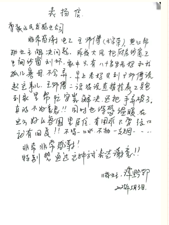 非常感谢电工王师傅(王宗荣),热心帮助业主解决问题。昨夜大风把厨房纱窗,卫生间纱窗刮坏,家中只有八十多岁老妈和我孤儿寡母,不会弄。早上老妈见到王师傅说起这事儿,王师傅二话没说直接拎着工具包到家里帮忙安装、解决,还把手弄破了。真的不好意思!!同时也深感温暖,在这么好的氛围里居住,有困难只要张口就有回复!!不喝一口水、不抽一支烟……
