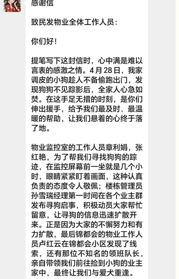 从你们身上,我们看到的是对业主的真诚关爱,体会到的是认真负责、乐于助人的工作精神。是你们的付出,让我们能一次次与小狗团聚!再次向卢红云、孙雪瑞、章利娟、张红艳等所有给予帮助的物业工作人员,致以最崇高的敬意和最衷心的感谢!祝愿民发物业蒸蒸日上,越来越好,也祝愿每一位工作人员身体健康,工作顺心,生活美满!