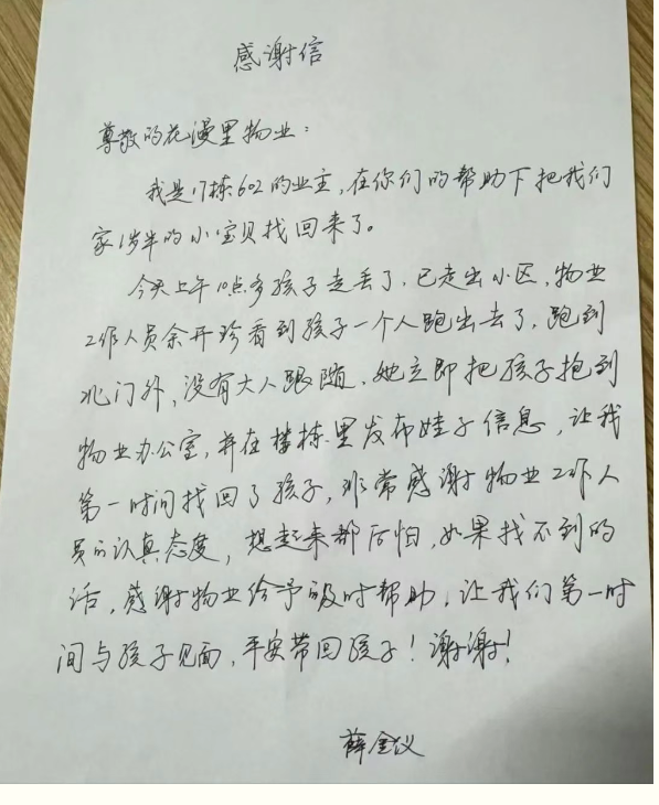 非常感谢物业工作人员的认真态度,想起来都后怕。如果找不到的话,感谢物业给予的及时帮助,让我们第一时间与孩子见面,平安带回孩子!谢谢!