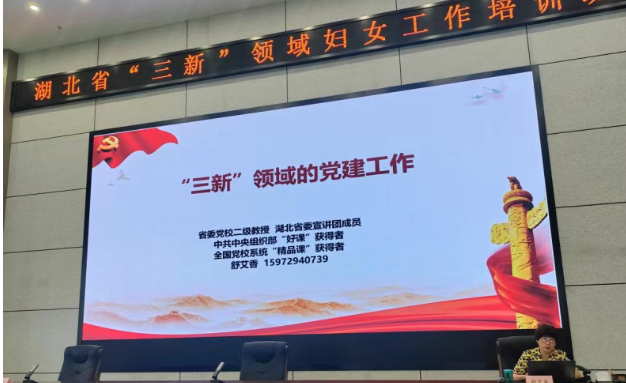 湖北省委党校舒艾香教授以《“三新”领域的党建工作》为题授课。她结合湖北支点建设大局,指出要坚持党建带妇建,通过组织共建、队伍共培、活动共联推进妇联组织建设。