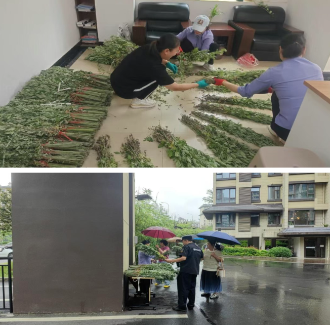 尽管当天下着雨,物业工作人员仍早早冒雨守在小区的两个大门口,当有小区业主路过时,工作人员热情地将一束束新鲜的艾草递给业主,并送上节日的祝福。业主们接过艾草,脸上洋溢着幸福的笑容,纷纷表示感谢。