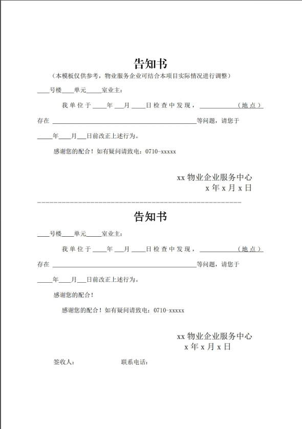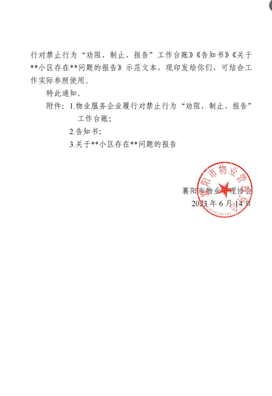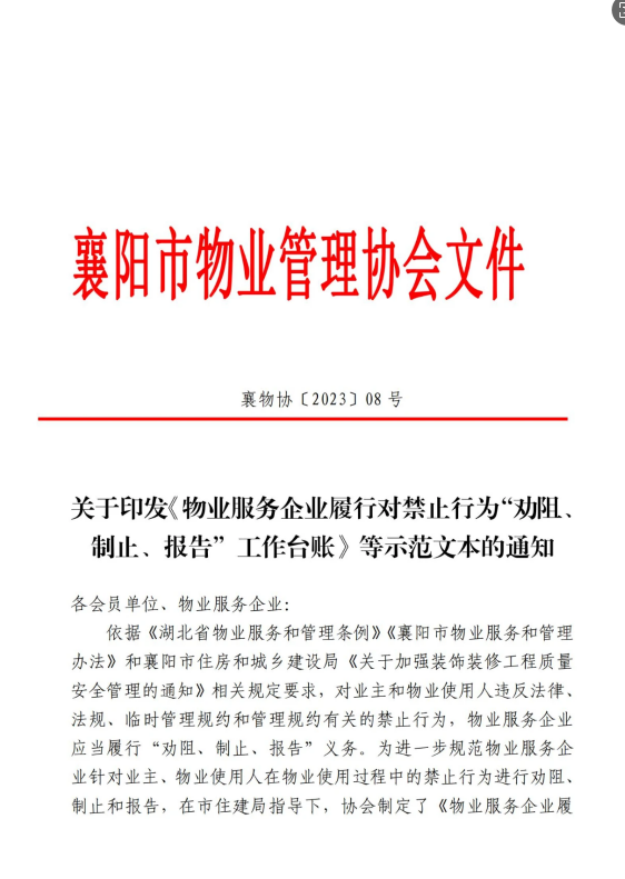 依据《湖北省物业服务和管理条例》《襄阳市物业服务和管理办法》和襄阳市住房和城乡建设局《关于加强装饰装修工程质量安全管理的通知》相关规定要求,对业主和物业使用人违反法律、法规、临时管理规约和管理规约有关的禁止行为,物业服务企业应当履行“劝阻、制止、报告”义务。为进一步规范物业服务企业针对业主、物业使用人在物业使用过程中的禁止行为进行劝阻、制止和报告,在市住建局指导下,协会制定了《物业服务企业履行对禁止行为“劝阻、制止、报告”工作台账》《告知书》《关于**小区存在**问题的报告》示范文本,现印发给你们,可结合工作实际参照使用。
