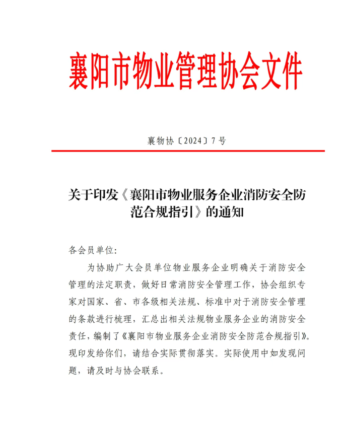 为协助广大会员单位物业服务企业明确关于消防安全管理的法定职责,做好日常消防安全管理工作,协会组织专家对国家、省、市各级相关法规、标准中对于消防安全管理的条款进行梳理,汇总出相关法规物业服务企业的消防安全责任,编制了《襄阳市物业服务企业消防安全防范合规指引》。现印发给你们,请结合实际贯彻落实。实际使用中如发现问题,请及时与协会联系。