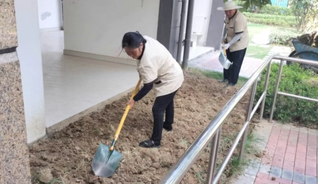 翻耕土壤,施肥改良土质:草坪铺种前,物业工作人员先将地面的枯枝杂物清理干净,用铁锹铲除老化干枯的草皮,将土地翻耕平整,翻耕深度不低于20公分,翻耕后将土包打散均匀,保证地面平整,撒上有机肥。