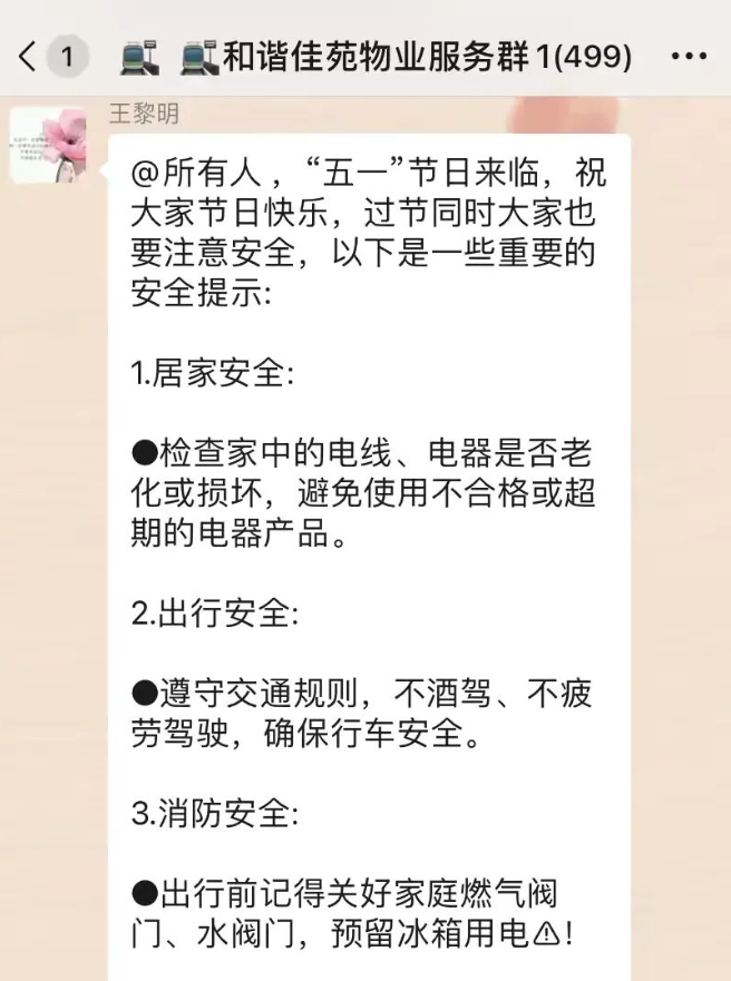 通过小区公告、微信群等方式,向业主宣传五一期间的安全注意事项,提高业主的安全意识和自我防范能力。提醒业主注意用火、用电、用气安全,不随意丢弃烟蒂,外出时关好门窗、切断电源等。