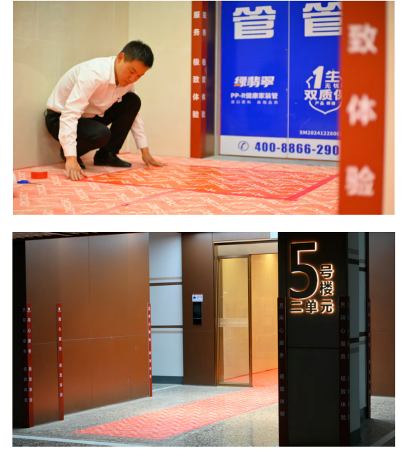 公区细节关怀更是无微不至。一楼大厅的大理石地面、墙角转角的艺术漆墙面、电梯轿厢的金属面板,这些公共区域在装修期间时刻面临“颜值危机”,稍有不慎便可能留下瑕疵。