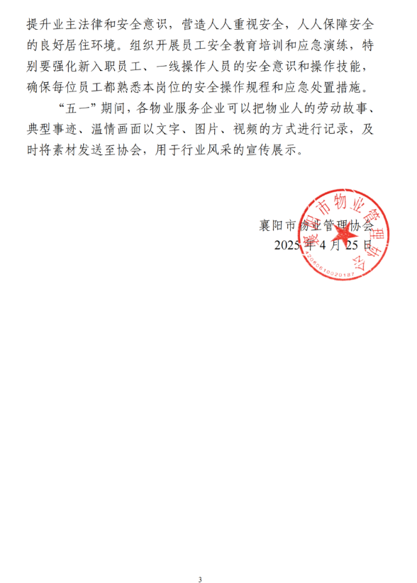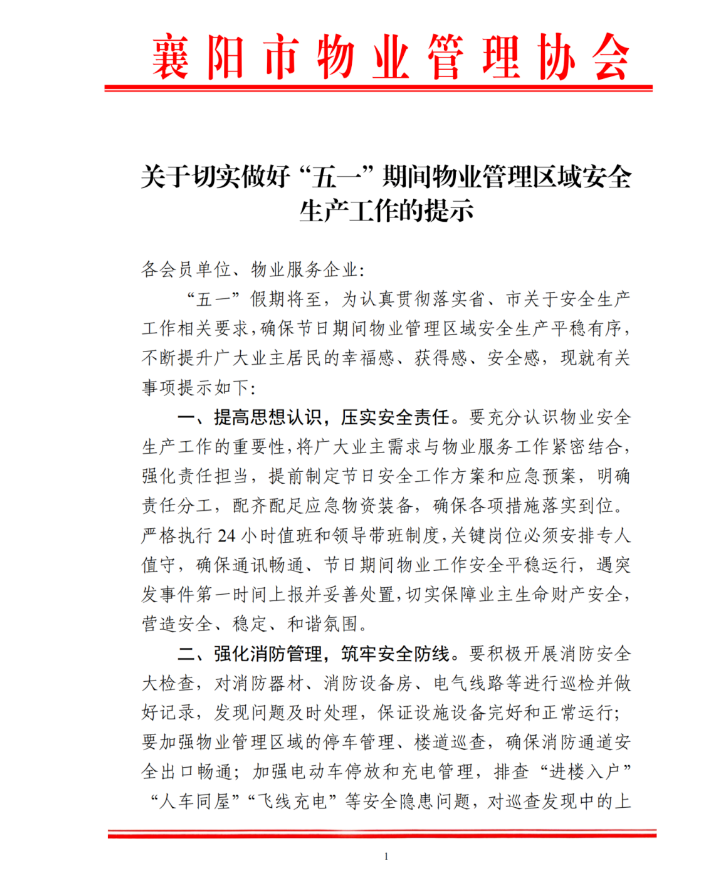 “五一”假期将至,为认真贯彻落实省、市关于安全生产工作相关要求,确保节日期间物业管理区域安全生产平稳有序,不断提升广大业主居民的幸福感、获得感、安全感,现就有关事项提示如下: