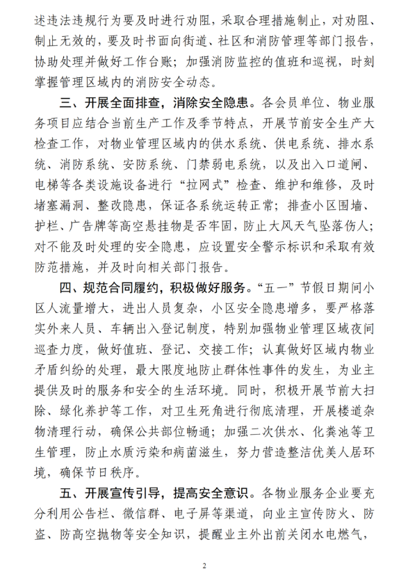三、开展全面排查,消除安全隐患。各会员单位、物业服务项目应结合当前生产工作及季节特点,开展节前安全生产大检查工作,对物业管理区域内的供水系统、供电系统、排水系统、消防系统、安防系统、门禁弱电系统,以及出入口道闸、电梯等各类设施设备进行“拉网式”检查、维护和维修,及时堵塞漏洞、整改隐患,保证各系统运转正常;排查小区围墙、护栏、广告牌等高空悬挂物是否牢固,防止大风天气坠落伤人;对不能及时处理的安全隐患,应设置安全警示标识和采取有效防范措施,并及时向相关部门报告。