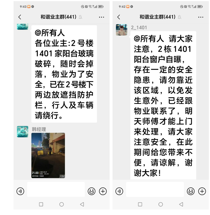 4月29日晚上,绿雅洪远物业工作人员通过小区业主群接到1401室业主反映,家中阳台钢化玻璃发生自爆。物业人员立即上门查看,发现自爆窗户正对楼下行人通道及停车区域,存在严重安全隐患。