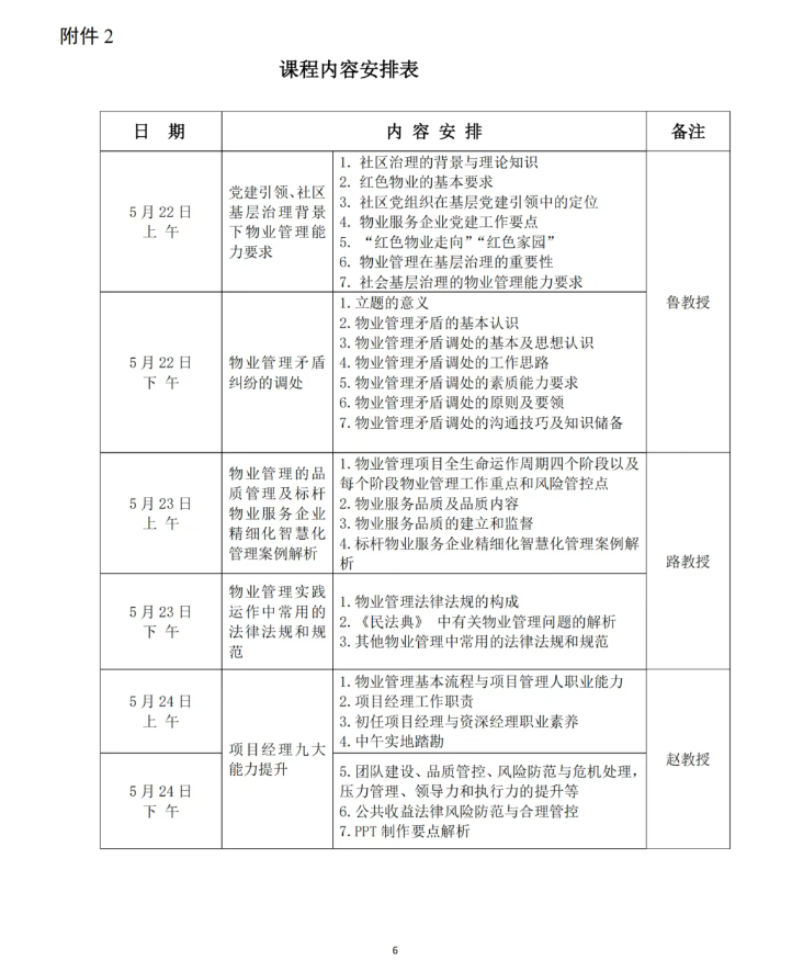 培训课程围绕物业管理实践运作中常用的法规和规范。党建引领,红色物业建设、社区基层治理背景下物业管理能力要求、物业管理矛盾纠纷调处、物业管理全生命运作周期四个阶段以及每个阶段物业管理重点和风险管控点、物业管理的品质及标杆物业服务企业精细化智慧化管理案例分析、项目经理九大能力提升、分组沙盘研讨。