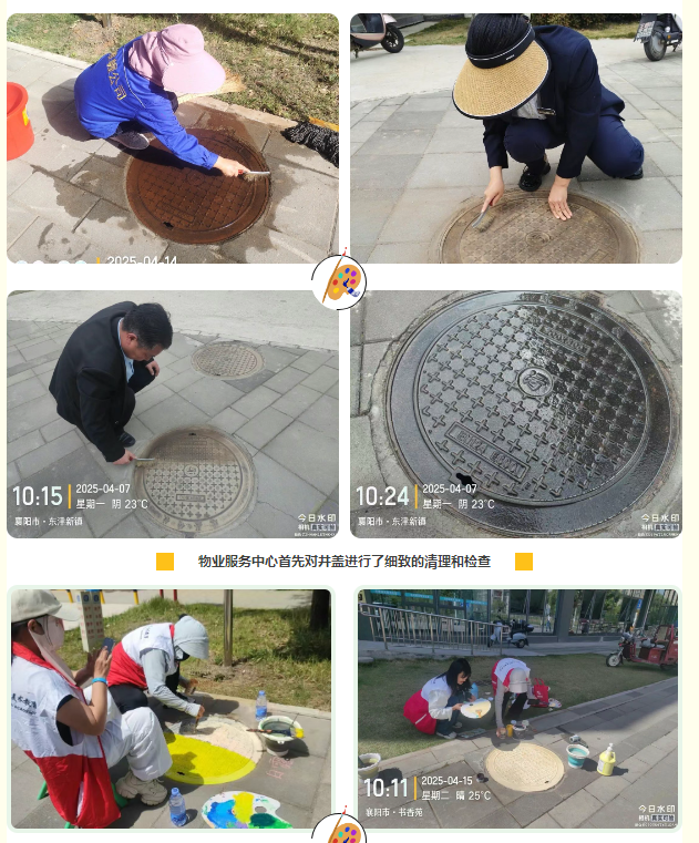 4月7日,书香苑文星苑物业服务中心项目经理曹露带领客服主管及保洁员,对社区的井盖展开深度清洁工作;24个原本灰扑扑的井盖悄然换上“新装”。艺达芬奇美术馆学校的老师们化身志愿者执笔,以二十四节气为主题,用色彩点亮社区公共空间,为社区增添了生机与活力,吸引了众多小区居民驻足观赏。